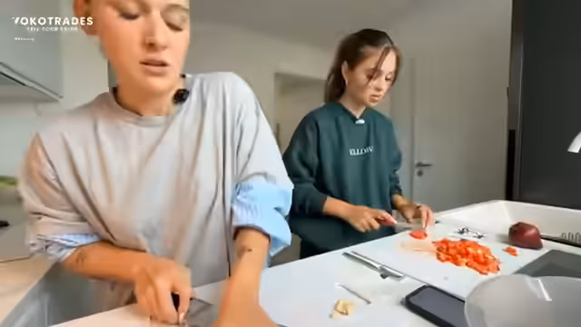 00:58:48Die Streamerinnen zeigen ihre Schneidekünste und diskutieren darüber, wie man eine Gurke richtig schält. Eine Streamerin hasst Gurkenschale und wäscht die Gurke auf eine besondere Art. Sie erinnert sich an eine Szene, wo Ken mit Jenna ihre Gurke schneidet. Pommes werden vorbereitet. Eine Streamerin erzählt, dass sie auf Malta fast jeden Abend gekocht oder gebacken hat. Dann wird eine Anekdote über die Katze Blue erzählt, die aus ihrem Sicherheitsgeschirr entkommen ist, aber nicht weggelaufen ist, sondern sich vor die Streamerin gesetzt und geniest hat.