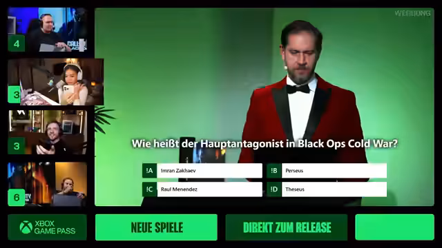 06:03:55Der Moderator begrüßt die Call of Duty Content Creator Hupfi, Saltys (Serena) und Finn Coop. Besonders hervorgehoben wird die visuelle Darstellung von Saltys im Stream, die für Begeisterung sorgt. Es wird die mögliche Ankunft von Nuketown im Spiel während des Streams thematisiert. Neben dem gemeinsamen Spielen von Call of Duty Black Ops 7 wird auch ein Quiz angekündigt, bei dem die vier Streamer gegeneinander antreten und die Zuschauer im Chat ebenfalls mitmachen können. Der Quizmaster Daniel Veith erklärt die Regeln und die Preise, die gewonnen werden können, darunter Call of Duty-Pakete und der Hauptpreis, ein Fan-Paket mit exklusiven Items und Codes für den Xbox Game Pass Ultimate sowie die Vault-Edition von Black Ops 7. Die Quizfragen drehen sich um die Call of Duty- und Black Ops-Reihe.