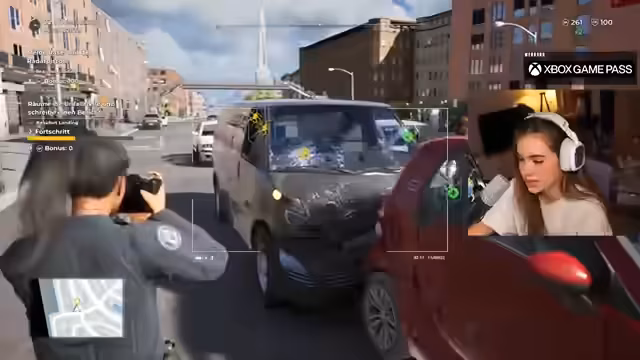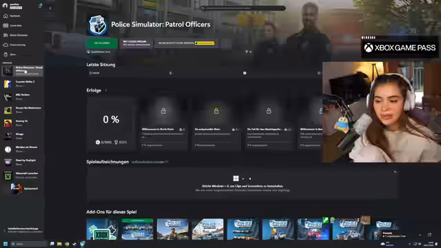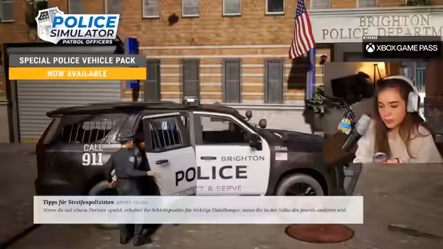 03:00:45Nachdem sie die Vorteile des Game Pass nochmals betont hat – die Verfügbarkeit auf PC, Konsole und Cloud-Gaming sowie Handheld –, startet sie das angekündigte Spiel, 'Police Simulator Patrol Officers'. Sie und ein Partner haben anfangs Schwierigkeiten, eine gemeinsame Lobby zu erstellen und sich gegenseitig einzuladen, was zu technischen Hürden und etwas Chaos führt.