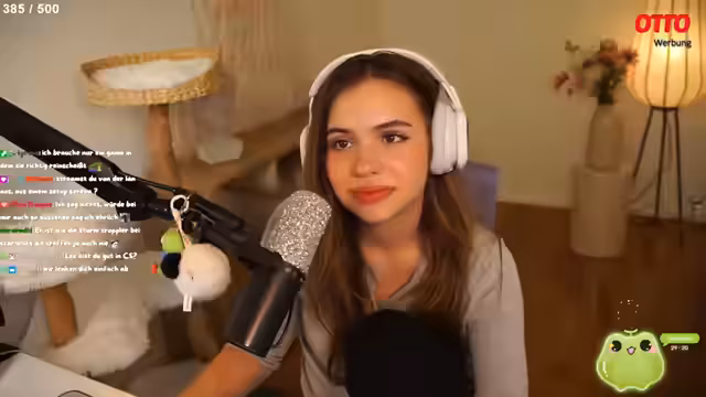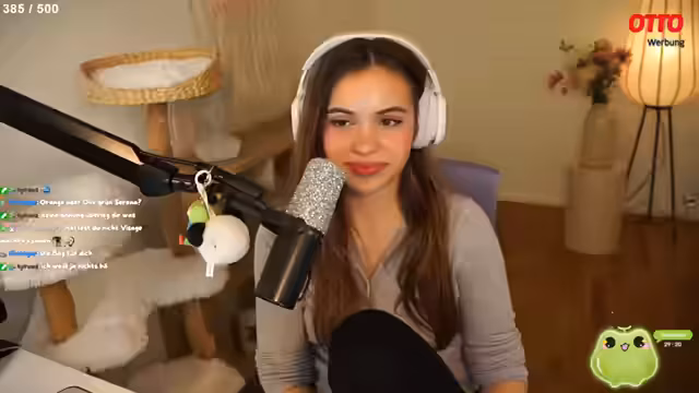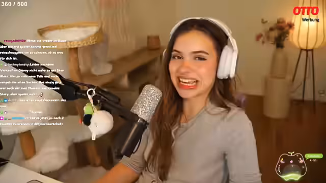 01:20:05Zurück bei der Einrichtung ihres Streaming-Zimmers zeigt die Streamerin ihren aktuellen Standort mit Lampe, Vase und Kommode. Sie erwähnt, dass sie ihre Katzen noch daran gewöhnen muss, auf dem neuen Möbelstück zu schlafen. Bei der Durchsicht der Otto-Produkte kommt sie auf die Idee, das Zimmereinrichtung durch ein 'Flashbang'-Schild zu ergänzen, das rot oder pink leuchtet. Anschließend unterhält sie sich mit dem Chat über persönliche Vorlieben in Film- und Serienwelten wie Star Wars, Harry Potter und Herr der Ringe, wo sie offen zugibt, dass sie Herr der Ringe nie wirklich mochte.