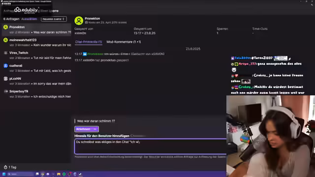 00:37:59Es beginnt die Bearbeitung von Entbannungsanträgen. Der erste Fall betrifft einen Nutzer namens Mark, der im März einen Kommentar als Bot hinterließ und später gesperrt wurde. Die Streamerin ist unentschlossen, ob der Nutzer einen Mehrwert für den Chat darstellt, und überlässt die Entscheidung dem Chat. Trotzdem wird der Nutzer auf Wunsch des Chats gebannt gelassen. Im nächsten Fall wird ein jüngerer Nutzer namens Articap entbannt, der sich für einen Kommentar entschuldigt hat und noch zur Schule geht. Ein weiterer Fall betrifft einen Nutzer namens FreeHT, der vor zwei Jahren wegen Stream-Sniping und Hacking gebannt wurde. Obwohl der Nutzer einen ausführlichen Entschuldigungstext verfasst hat, ist die Streamerin unentschlossen und überlässt die Entscheidung erneut dem Chat, der sich für eine Entbannung ausspricht. Die Streamerin kommentiert humorvoll, dass die Haftzeit von zwei Jahren ausreichend sei.