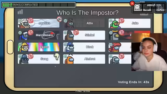 06:59:12Die Streamerin äußert ihren Unglauben und ruft aus, dass es Juke ist. Sie fragt den Chat, ob sie den Button drücken soll und entscheidet sich dann dafür. Sie erklärt, dass sie eine Information die ganze Zeit unterschlagen hat und es ihr leid tut für die Person. Es gibt eine Aufgabe, die Juke nicht gemacht hat, die aber jeder machen muss. Die Streamerin hat die Aufgabe gemacht. Es wird nicht weiter ausgeführt, um welche Aufgabe es sich handelt, aber es wird impliziert, dass dies der entscheidende Beweis für Jukes Täterschaft ist. Die Spielrunde endet mit der Entlarvung von Juke als zweitem Imposter.