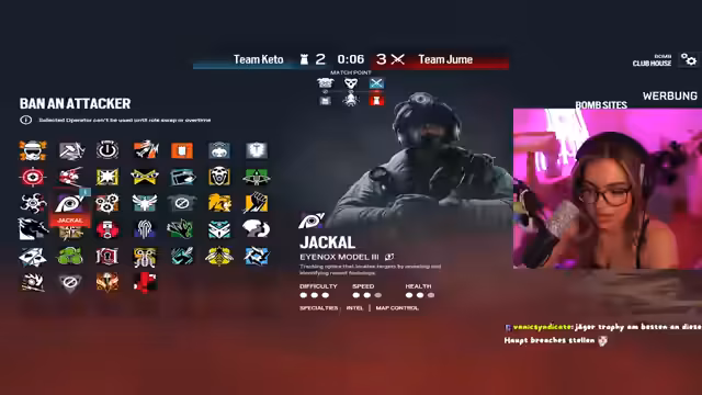 02:30:30Das Turnier beginnt offiziell. Die Teams wurden zusammengestellt und die Spielmodi sind festgelegt. Man startet mit der Angriffsphase auf der Map 'Clubhouse'. Vor dem ersten Match beginnt die sogenannte 'Bannphase', in der ein Operator für das gegnerische Team gebannt wird, um dessen Strategie einzuschränken. Das Team entscheidet sich dafür, den Operator Mira zu bannen.