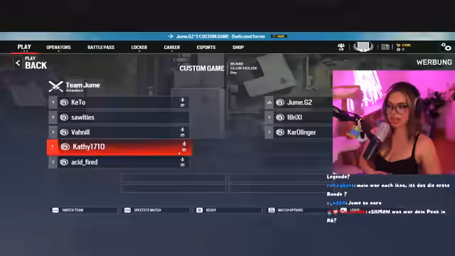 01:48:23Die Vorbereitung auf ein bevorstehendes Turnier steht im Fokus. Der Streamer und seine Teammates passen ihre Grafik-Einstellungen an, um Performance zu verbessern, und wählen ihre Operatoren für das bevorstehende Match. Sie diskutieren Strategien, die verstärkten Wände auf der Map 'Clubhouse' und wie sie ihre Positionen halten können. Es gibt technische Schwierigkeiten bei der Erstellung des Teams im Turnier-Modus, die schließlich gelöst werden.