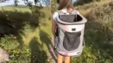 Während eines Ausflugs durch die ländliche Umgebung wurde die Hauskatze Finlay in einen speziellen Rucksack verpackt, um sie sicher zu transportieren. Der Spaziergang führte durch einen Wald, wo verschiedene Tiere wie Schafe und eine Gans gesichtet wurden. Finlay zeigte Neugier und schnupperte an einem Baumstumpf, war aber auch ängstlich gegenüber Fahrradfahrern.