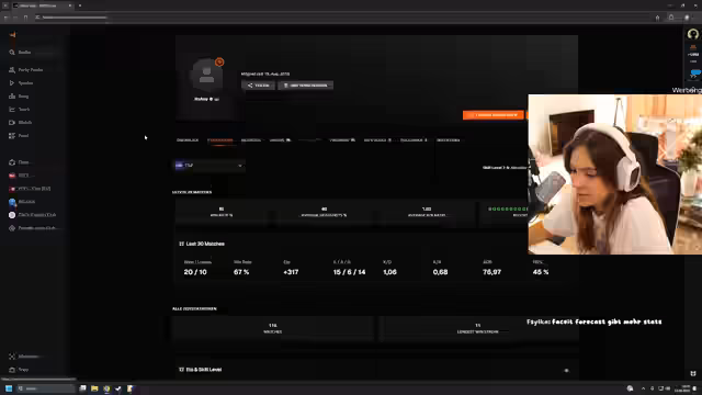 06:31:51Der Streamer spricht über das Faceit-System und die Auto-Accept-Funktion, die er nicht nutzen möchte. Es werden Statistiken von Stefan und Felix verglichen, wobei Stefan einen KD von 0,68 und Felix einen KD von 1,3 hat. Der Streamer erklärt auch, wie man diese Stats einsehen kann und welche Informationen dort zu finden sind. Es folgt eine Diskussion über die eigenen Platzierungen und Erfolge.
