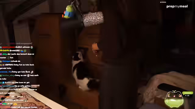 02:58:31Der Fokus verschiebt sich auf die beiden Katzen, Finlay und Nimbus. Die Streamerin zeigt, wie sie die Tiere füttert und kommentiert ihr Verhalten. Finlay wirft ein Leckerli versehentlich herunter, während Nimbus es direkt frisst. Die Streamerin versucht, Finlay einen High Five beizubringen, was auf seine schlaue, aber auch sture Art anspielt und für humorvolle Momente sorgt.