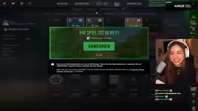 04:41:34Ich habe jemanden gefragt, ob er mir Smokes beibringen kann, bin aber unsicher, ob er gerade da ist. Das Training soll noch eine Stunde dauern, und um 21 Uhr soll Mark da sein, um uns zu unterrichten. Ich spiele jetzt ein Game und gehe dann ins Crash-Out. Ich bin müde und sehe fertig aus. Die Zuschauer dürfen entscheiden, ob ich Faceit oder Premiere spielen soll. Die Entscheidung fällt auf Faceit, obwohl ich befürchte, dadurch gebrochen zu werden. Ich bedanke mich bei Torben für die Tech9 und hole mir noch etwas zu trinken. Ich zeige mein Faceit-Profil und gehe kurz aufs Klo und in die Küche, um etwas einzuräumen. Währenddessen gibt es technische Probleme mit dem Chat, aber schließlich funktioniert er wieder.