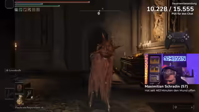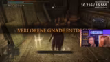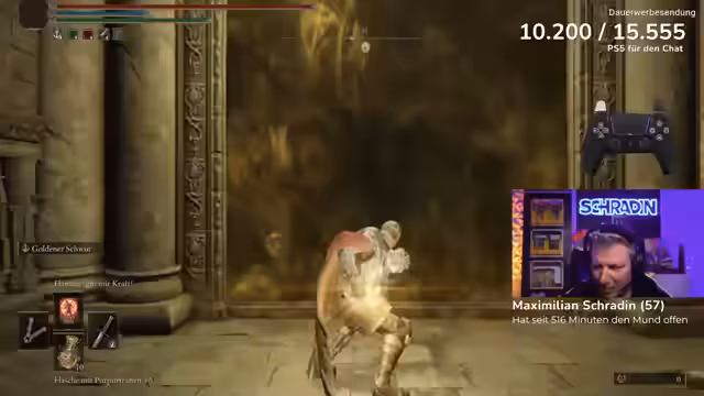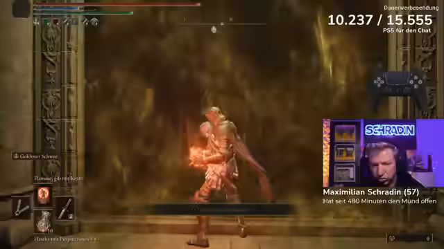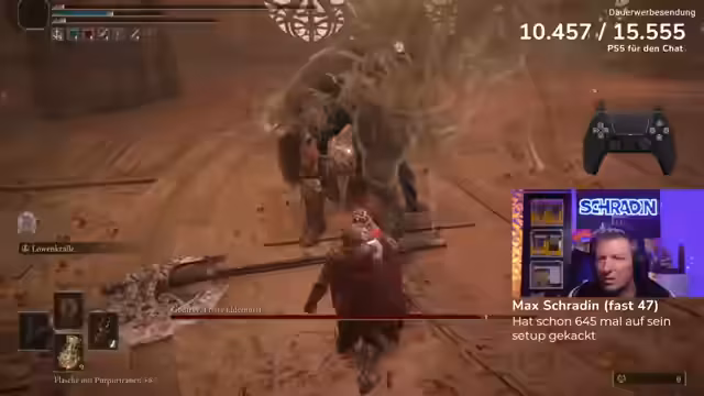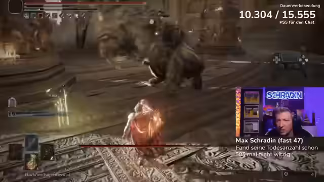 09:51:39Der letzte Bosskampf des Streams findet gegen Godfrey statt, der als einer der drei schönsten Bosse im gesamten Spiel bezeichnet wird. Der Streamer betritt den Kampf mit viel Selbstvertrauen, muss jedoch schnell feststellen, dass Godfrey ein extrem harter Gegner ist. Die Kämpfe ziehen sich über viele Versuche hinweg, wobei der Streamer immer wieder Probleme hat, die richtigen Zeitfenster zum Ausweichen und Heilen zu finden. Der Chat und der Coach geben kontinuierlich Tipps, aber der Frust wächst stetig, da der Boss sehr aggressiv angreift und kaum Zeit zum Reagieren lässt.