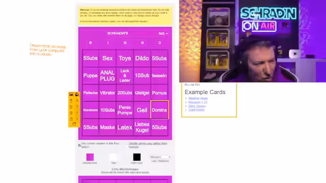 00:25:26Nach der allgemeinen Einführung beginnt der Streamer damit, das Bingo-Karton für das heutige Event zu erstellen. Das Thema ist ein Tag im größten Sexshop Europas, basierend auf einem Video von Tomatolix. Der Streamer liest Begriffe vor, die der Chat liefert, um die Felder zu befüllen. Der Inhalt der Felder ist sehr explizit und umfasst Begriffe wie Dildo, Kondome, Lack und Leder sowie BDSM. Die Erstellung des Kartons ist von der Interaktion mit dem Chat geprägt, der aktiv Begriffe vorschlägt, während der Streamer sich dabei teilweise überfordert und unwohl zeigt.