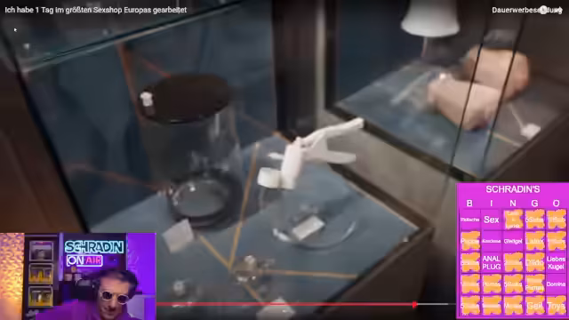 00:39:46Nachdem das Bingo-Karten erstellt ist, beginnt der eigentliche Reaction-Teil. Der Streamer und die Community schauen sich das Video über den Tag im Sexshop an. Während des Videos kommentieren und reagieren sie auf die gezeigten Inhalte. Der Streamer ist dabei von den gezeigten Produkten und den Interviews mit den Mitarbeitern sichtlich überrascht und überfordert. Die Community reagiert mit Emojis und Kommentaren auf das Geschehen, wodurch eine interaktive Stimmung entsteht. Die Regeln des Bingos werden dabei live umgesetzt und abgearbeitet.
