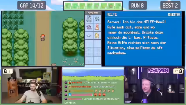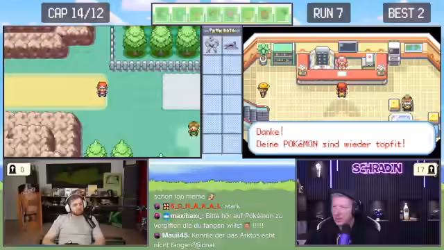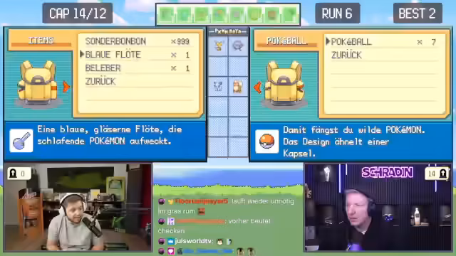 02:45:01Nach dem Abstech zu persönlichen Themen kehren Trymacs und Schradin zum Spiel zurück. Sie flüchten vor einem gefährlichen Gegner und besuchen den Markt, um neue Pokébälle und Gegengift zu kaufen. Trymacs kritisiert den keifenden Ton von Schradin im Menü und dessen übertriebene Verwirrung über die einfachsten Shop-Optionen, die er hunderte Male gesehen hat.