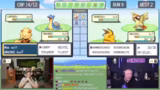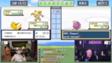 00:44:40Nach der Wahl der Starter beginnt der erste Kampf. Trymacs kämpft mit seinem Zapdos und Smogon gegen einen wilden Raupi. Obwohl er das Spielprinzip wie Giftwolke einsetzen soll, versteht er die Taktik nicht und verliert den Kampf. Sein Pokémon erhält jedoch Erfahrungspunkte und steigt im Level. Trymacs ist begeistert vom Level-Up, ignoriert aber grundlegende Spielfunktionen und verwirrt Schradin durch rassellose Aktionen und Unwissen über die Stärken und Schwächen seiner Pokémon.