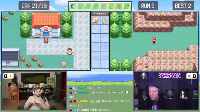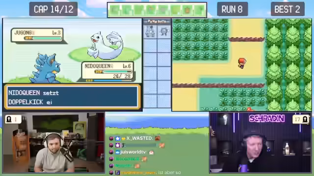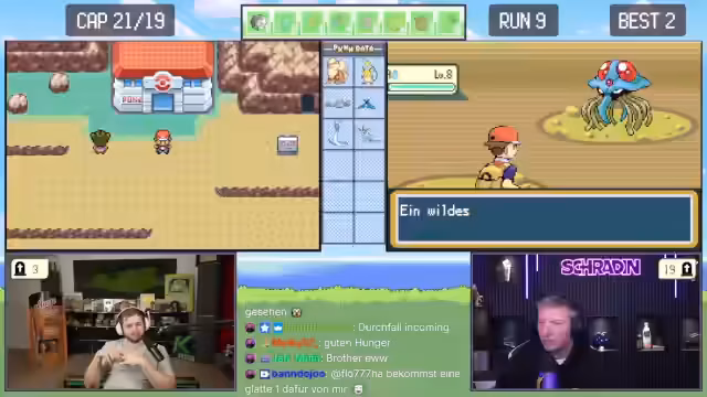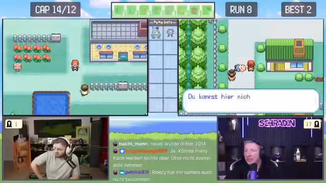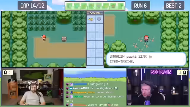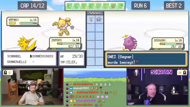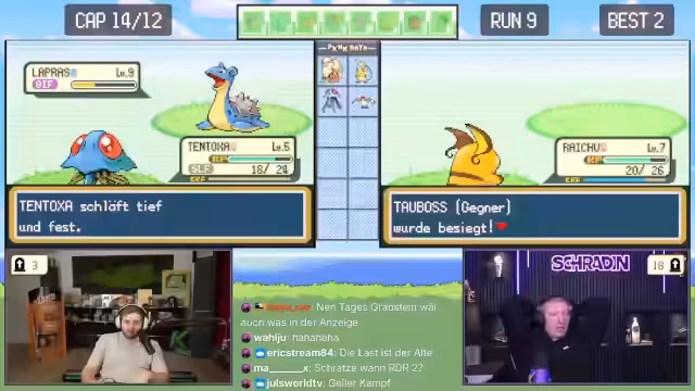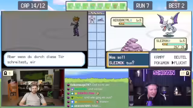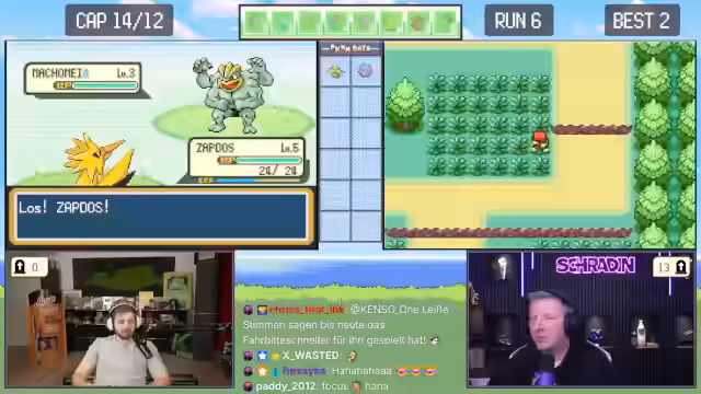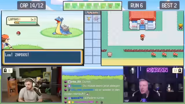 02:12:22Während der Suche nach neuen Pokémon erhalten Trymacs und Schradin zufällige Begegnungen. Schradins Pokémon Taupsi stirbt, während er es fangen will. Trymacs trifft auf ein legendäres Zapdos, was sofort als nicht fangbar gilt und ein sofortiges Fliehen erfordert, da es sonst den Run beendet. Der Fokus liegt auf der hohen Verlustrate bei frühen Begegnungen mit starken Pokémon.