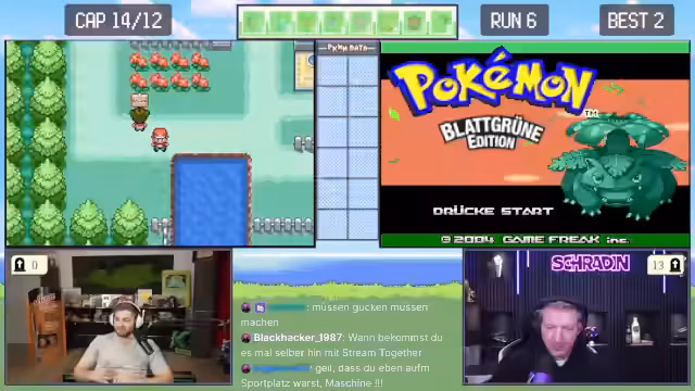 01:51:19Am Anfang des Streams klärt Trymacs über eine Kameraeinstellung auf, die sein Gesicht lila erscheinen lässt und sich nicht auf einen Gesundheitszustand bezieht. Anschließend beginnt die Pokemon-Challenge mit Duo-Soli-Modus, wobei der Chat nur Emotes verwenden darf. Das erste Pokémon von Trymacs ist Smogon, ein Gift/Pflanze-Typ, und das von Schradin ist Knofensa. Beide starten gegen den ersten Trainer, Käfersammler Rudolf.