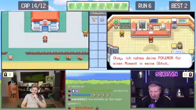00:48:17Nach dem Kampf haben die Streamer Schwierigkeiten, dieRoute in Alabastia zu finden. Trymacs rennt ständig gegen Mauern, kennt den Weg nicht und wird ungeduldig. Schradin, der den Weg kennt, ist frustriert über Trymacs fehlendes Orientierungsvermögen und seine Langsamkeit. Gemeinsome überwinden sie die Hürden, finden Professor Eichs Labor und erhalten das erste Pokémon, Trymacs' Auswahl für die Herausforderung. Der Fokus liegt auf ihrer unterschiedlichen Herangehensweise zum Gameplay.