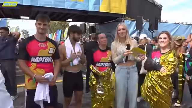 03:26:52Die Frogs gewinnen das Rennen mit einer Zeit von 47 Minuten und 10 Sekunden und erhalten als Belohnung eine Geldsumme für einen guten Zweck. Die Sharks folgen als Zweite, während weitere Teams wie die Raptors und Dragons ebenfalls ins Ziel kommen. Die Siegerehrung wird im VIP-Zelt bei Skyline TV fortgesetzt, wo die Teilnehmer feiern und ausruhen. Die Teams werden für ihre Teamleistung und Ausdauer gefeiert.