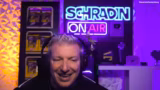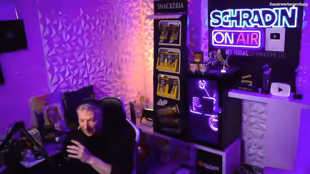 00:55:49Schradin startet in die Quizshow Wer wird Millionär? und muss sich zunächst mit humorvollen Beleidigungen im Chat herumschlagen. Die erste Quizfrage lautet: 'Was kann man im Supermarkt kaufen? A. Wochenleim, B. Tagespatex, C. Stundenuhu oder D. Sekundenkleber.' Nachdem Sekundenkleber als Antwort ausgewählt wird, geht es mit einer weiteren Frage weiter: 'Robert Lemke fragte seine Gäste, welches Schwein A guckt am meisten fern, B hätten's denn gern, C wollen sie verzehren oder D kann Physik erklären?' Hier nutzt der Streamer einen Publikumsjoker, der zu 70 Prozent für Antwort B stimmt.