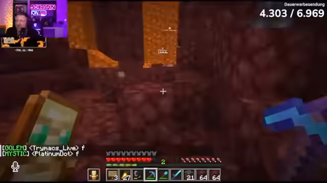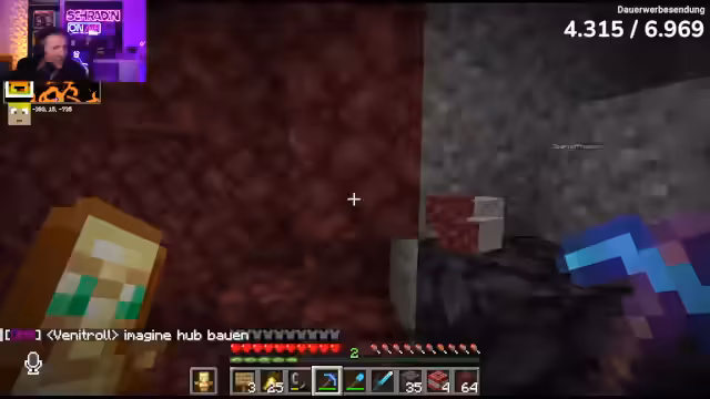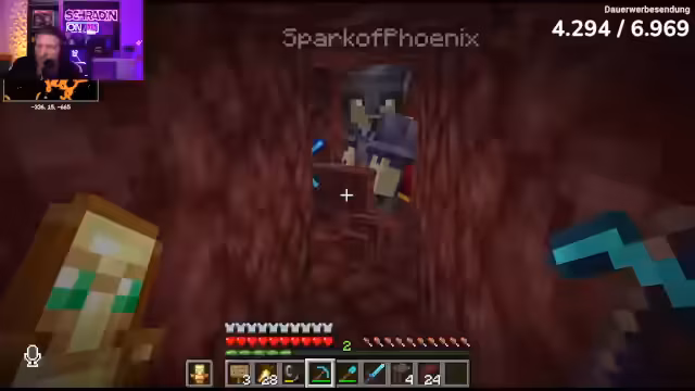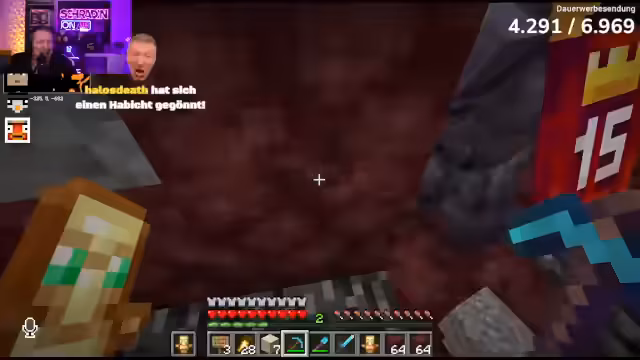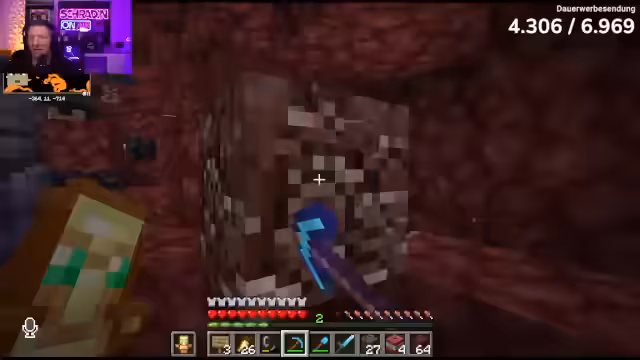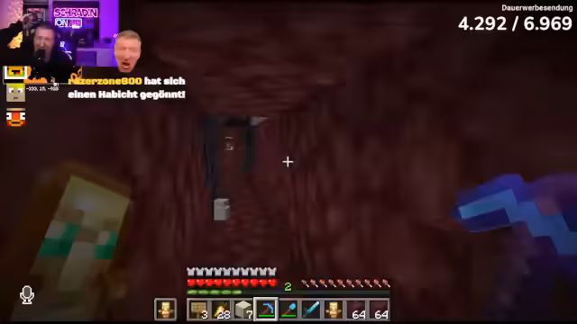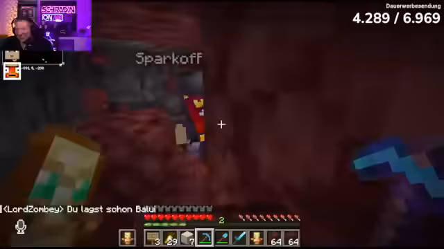 02:27:11Während der Erkundung des Nethers nutzen sie eine Karte, die die Lava-Blasen anzeigt, obwohl Spark betont, dass dies eigentlich ein „Schummel“ ist, da man so durch Wände sehen kann. Ihre Strategie ist es, einen langen Tunnel zu graben, um sich vom überfarmten Spawn-Gebiet zu entfernen und frische Netherite-Vorkommen zu finden, die hauptsächlich auf Höhe 15 generiert werden. Spark erklärt, dass er sich die Orientierung im Nether auch ohne Karte merken kann. Während sie sich durch die Höhlen graben, kommt Trimax hinzu, und es entbrennt eine humorvolle Diskussion über einen McDonalds-Burger. Trimax ärgert sich darüber, dass Chef Strobl einen bestimmten Burger gegessen hat, obwohl Trimax ihm davon abgeraten hatte, was der Streamer sehr lustig findet. Die Anekdote dreht sich um die „Verzwiebelung“ des Burgers und Trimax' Leidenschaft für Burger-Wissen, die dazu führte, dass er den Streamer wegen des Vorfalls anrief und ihn weckte.