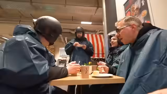 07:52:26Nach einer langen und anstrengenden Fahrt, die länger war als geplant, erreichen die Teilnehmer endlich ihr Zielort. Die Stimmung ist gemischt aus Erleichterung und einem Hauch von Wahnsinn. Draußen angekommen, suchen sie sofort die Nähe einer Wärmequelle. Es folgen Dankesworte an das Team, das die Aktion organisiert hat, und eine erste Runde Aufwärmgetränke, um sich von der nasskalten Tour zu erholen.