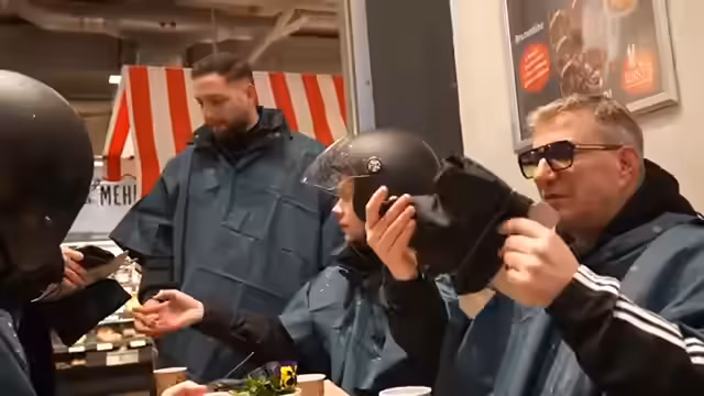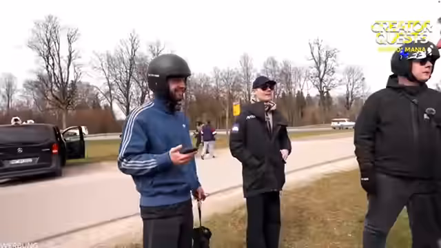 02:38:13Ein verkleideter Mann als Schildkröte mit grün bemaltem Gesicht und Haustraschel fährt am Stream vorbei, was für Verwirrung sorgt. Die Streamer diskutieren, ob es sich um eine geplante Aktion oder eine zufällige Begegnung handelt. Nachdem die Verkleidung als real erkannt wurde, bereiten sie sich auf die Weiterfahrt vor. Die Akku-Ladezustände der Roller werden kontrolliert, ein Mikrofon-Wechsel vorgenommen und Süßigkeiten für die Fahrt bereitgestellt. Nach einem kurzen Stopp, bei dem Sascha fast umfällt, beginnt die Fahrt in Richtung Ausgangspunkt. Zeitlich wollen sie sich etwas holen, um mögliche Dunkelheit zu vermeiden.