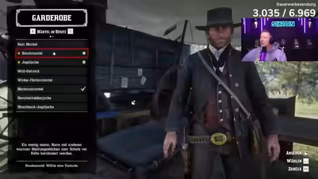 05:22:19Der Streamer bereitet sich intensiv auf den angekündigten Zugüberfall vor. Er verbringt viel Zeit damit, die passende Kleidung und Ausrüstung auszuwählen, darunter einen Montana-Mantel. Währenddessen entstehen logistische Probleme, da er Schwierigkeiten hat, den Ort des Überfalls zu finden und Wegpunkte auf der Karte korrekt zu setzen, was den Zeitplan in Gefahr bringt.