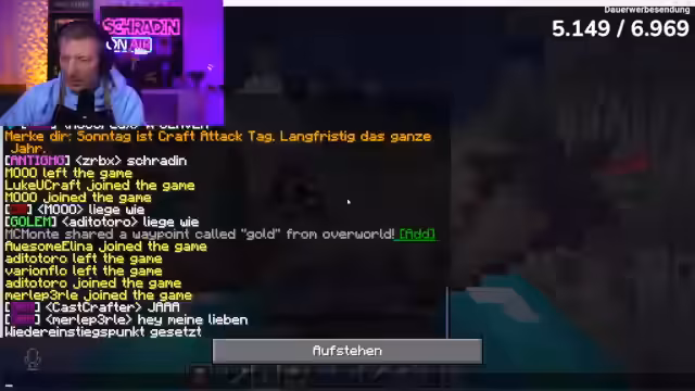 10:12:43Der Streamer reflektiert über die verbrachte Zeit auf dem Craft Attack-Server und präsentiert beeindruckende Spielstatistiken von über 128 Stunden. Er zählt die Menge abgebauten Netherracks und getöteter Mobs auf und schätzt den Abschluss des Projekts als zählende Runde an. Ein Spieler gibt zu, versehentlich etwas zu zerstören und entschuldigt sich, während die Geschichte von den hohen Spielzeiten und den gemeinsamen Erlebnissen, wie der Eröffnung des Eiffelturms, im Mittelpunkt steht.