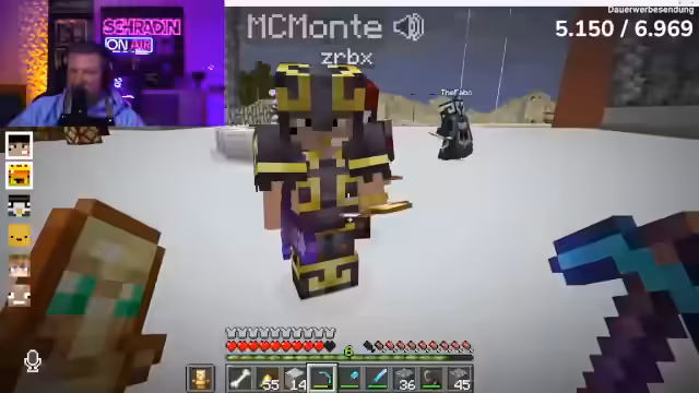 03:33:40Der Streamer wird von Hugo und Monte konfrontiert, die ihn zur Rede stellen und das TNT zurückfordern. Monte versucht, eine faire Lösung zu finden, indem er an die früheren Abmachungen bezüglich der Knochen für Kylo erinnert. Der Streamer fühlt sich jedoch weiterhin gehänselt und ungerecht behandelt. Zabex beschuldigt den Streamer und Noisy, seine Base gesprengt und seine Netherite-Rüstung zerstört zu haben. Norex schlägt vor, dass alle zum Nether Hub kommen, um eine Erklärung zu erhalten. Die Situation bleibt angespannt, und es ist unklar, wie das Finale des Live-Streams ausgehen wird. Der Streamer bleibt misstrauisch und ist bereit, weitere Sprengungen vorzunehmen, wenn er sich weiterhin bedroht fühlt.
