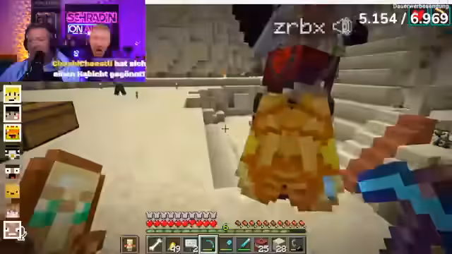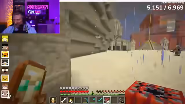 04:48:14Schradin und Marcel gerieten in eine hitzige Diskussion über vergangene Sprengungen und Vertrauensbrüche. Marcel beschuldigte Schradin, unter seinem Haus TNT platziert und gesprengt zu haben, obwohl ein Friedensangebot gemacht wurde. Schradin verteidigte sich damit, dass er zwar Lava-Blöcke entfernt hatte, aber nicht mit der Absicht, Isairs Apartment zu zerstören. Nach einer langen Debatte einigten sich die beiden auf einen Waffenstillstand und erklärten sich zu Freunden, wobei Schradin Marcel in sein 'Team Schradin Minecraft' aufnahm. Diese Versöhnung wurde von den anderen Spielern mit gemischten Gefühlen aufgenommen, da die vorherigen Konflikte tief saßen. Die Situation blieb angespannt, da die Spieler weiterhin über die Fairness der Sprengungen und die Glaubwürdigkeit der Friedensangebote diskutierten.