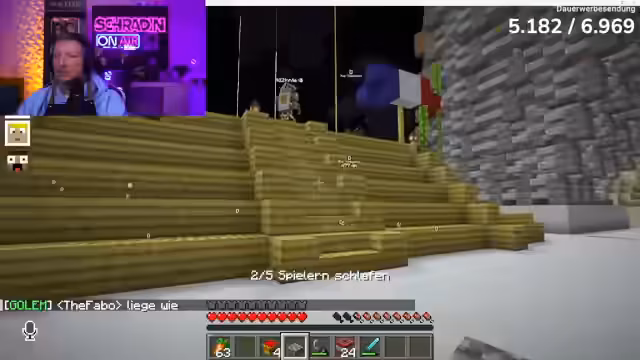 04:40:14Der Stream nähert sich dem Ende, und die emotionale Belastung der Teilnehmer ist spürbar. Es ist Schradins letzter Tag auf dem Server, und der Verlust seiner aufwändig gebauten Pyramide trifft ihn tief. Die Atmosphäre ist von Frust und Verrat geprägt. Zabex und Monte überlegen, den ägyptischen Löwen auf Zabex' Turm zu sprengen, was den finalen Höhepunkt des Konflikts bildet.