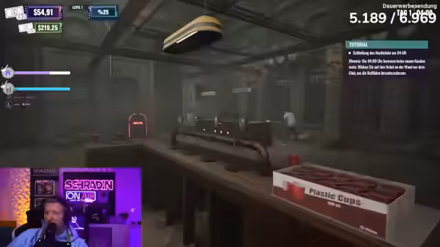 06:51:41Anfangs gibt es wiederholte technische Probleme mit dem Upgrade der Kassentheke, das blockiert wird. Nach der Beseitigung eines verbackenen Bechers kommt es zu einer neuen Störung durch einen abgewiesenen Kunden. Der Streamer beschwert sich über den Kollegen, der den Club ohne vollständige Vorbereitung öffnet und das Arbeitsklima als belastend empfindet, was zu einem verbalen Streit und der Androhung eines eigenen Konkurenten führt.