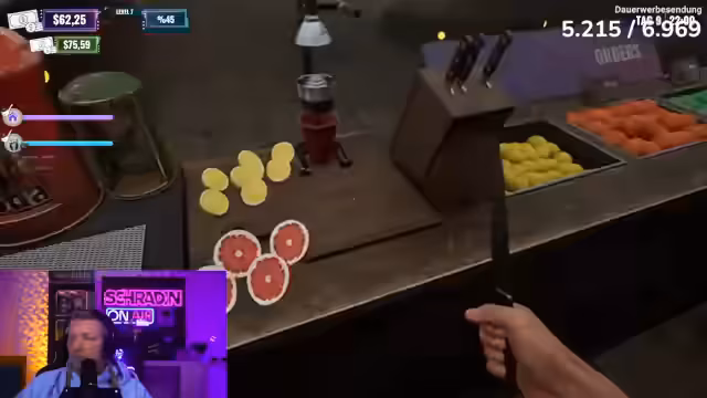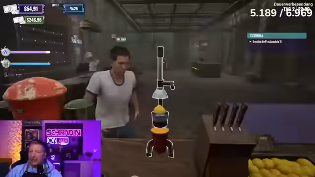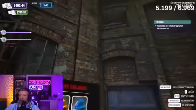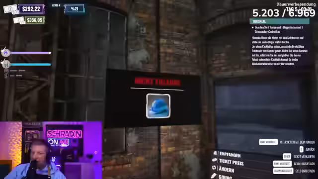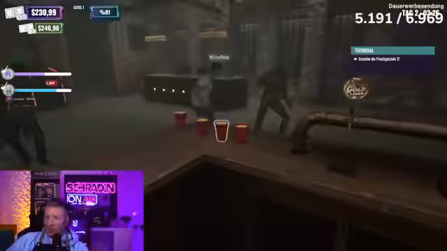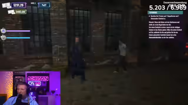 08:13:01Im Clubsimulator herrscht akutes Chaos, als Schradin Schwierigkeiten hat, die Getränkebestellungen korrekt auszuführen. Mehrere Fehler bei der Zubereitung von Fusion mit Zitrone, Iper Bier mit Limette und Stoutbier mit Soda führen zu Frustration und Beschwerden. Währenddessen versucht ein anderer Spieler, die Einnahmen zu sammeln, während Schradin mit den Bestellungen kämpft und sich selbst als unfähig bezeichnet. Die Situation eskaliert, als die Bestellliste aufgrund falscher Auslieferungen leer bleibt und Schradin eine zweite Abmahnung erhält, da er als Geschäftsführer die Geschäftsführung vermasselt. Trotz der Probleme wird überlegt, den Laden aufzurüsten, aber es stellt sich heraus, dass bereits alle Upgrades freigeschaltet sind, jedoch ein 100%iger Fortschritt in der 'Ruin Factory' fehlt, um den Club tatsächlich zu verbessern. Die Spieler beschließen, einen weiteren Tag zu arbeiten und dann den Club zu wechseln, um die letzte Nacht in der 'Stinke-Absteige' zu genießen, bevor sie in einen neuen, besseren Club umziehen.