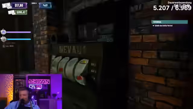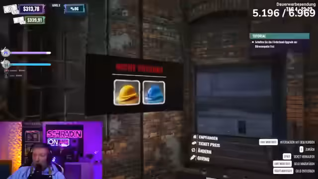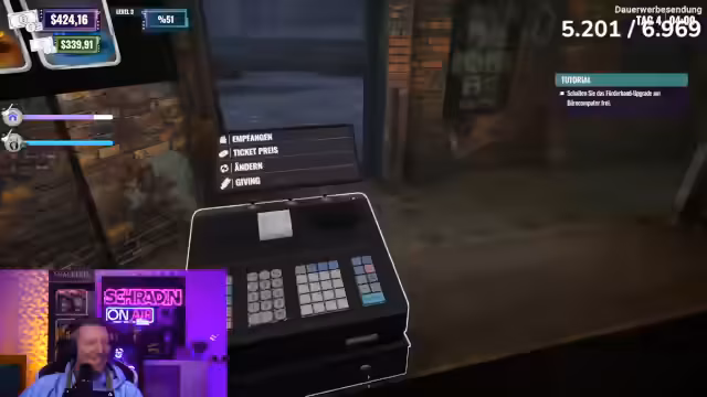 05:54:01Der Stream beginnt mit einem chaotischen Start des Clubsimulators. Zahlende Gäste mit Baustellenhelmen werden zum Problem, da Helme im Club nicht erlaubt sind. Schradin verkauft Tickets, gibt aber kein Rückgeld, was zu den ersten Unstimmigkeiten führt. Die Kassa und der Arbeitsablauf sind fehlerhaft, Kunden warten lange, und ein Kunde wird von einer Ente angegriffen. Die anfängliche Stimmung ist geprägt von Unordnung und mangelnder Effizienz.