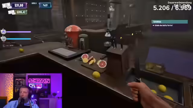 05:49:53Die Spieler lernen, wie man Bier zubereitet und Zitronen in Scheiben schneidet, um sie dem Bier hinzuzufügen. Der Streamer übernimmt das Zapfen des Bieres, während andere Spieler die Zitronen vorbereiten. Es kommt zu ersten Problemen, da der Streamer versehentlich Bier für sich selbst zapft und trinkt, was zu einer leichten Trunkenheit im Spiel führt. Die Kommunikation und Koordination zwischen den Spielern erweist sich als schwierig, da sie sich gegenseitig beschuldigen und in Schlägereien verwickelt sind, anstatt sich auf die Kunden zu konzentrieren. Der erste Tag im Club ist chaotisch, mit Kunden, die mit Bauhelmen erscheinen und abgewiesen werden müssen, und einer Ente, die den Club stürmt und zahlende Kundschaft verjagt. Trotz dieser Rückschläge versuchen die Spieler, die Bestellungen entgegenzunehmen und die Kunden zu bedienen, wobei das Trinkgeld der Kunden die Moral etwas hebt. Die Schwierigkeiten bei der Kassenführung und der Bierversorgung führen jedoch zu einer geringen Beliebtheit des Clubs.