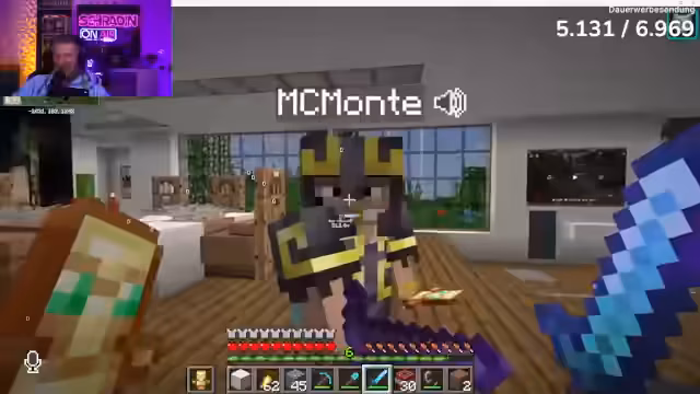 01:52:05Honeypoo überrascht den Streamer mit einem neu renovierten Penthouse in Minecraft, das sie für ihn gebaut hat. Sie führt ihn durch die luxuriöse Wohnung, die einen Aufzug, ein Wohnzimmer mit Kamin und lila Akzente, seine Lieblingsfarbe, enthält. Die Details, wie Pendelleuchten und ein Bild des Streamers über dem Kamin, werden hervorgehoben. Er ist sichtlich begeistert und scherzt über eine mögliche Hochzeit mit Honeypoo, da dies ein 'Liebesbeweis' sei. Die Freude wird jedoch getrübt durch die Sorge, dass andere Spieler, insbesondere Monte und seine 'Trials', das Penthouse zerstören könnten, da heute ein Tag der 'Zerstörung' sei. Honeypoo zeigt ihm auch praktische Elemente wie ein verstecktes Lager und einen Ofen.