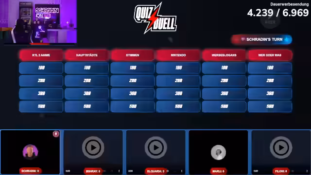 02:59:37Um 20 Uhr (ursprünglich 18 Uhr) startet das Quiz. Teilnehmer Schradin, Büschra, Alquaria, Philo und Mali richten Kameras über OBS Virtual Camera ein. F5-Taste wird zur Problemlösung bei technischen Einrichtungsproblemen genutzt. Rosemondi fehlt krankheitsbedingt. Regeln erklärt: Quiz-Duell mit Kategorien (100/500 Punkten), Punktabzug bei Fehlern, Buzzer per Leertaste.