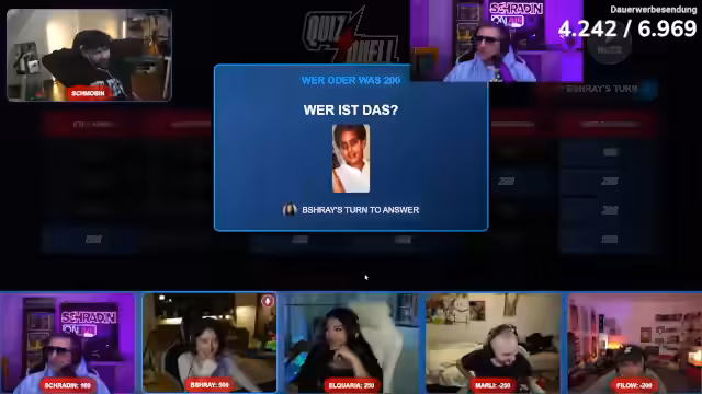 04:44:02Ein neues Quiz-Format wird eingeleitet, bei dem zwei bekannte Personen oder Streamer mit einer KI zusammengemischt werden. Die Teilnehmer müssen erraten, um wen es sich handelt, und erhalten für richtige Antworten Punkte. Das Spiel verläuft chaotisch, da die Buzzer-Funktion Probleme bereitet und viele Fragen falsch beantwortet werden. Die Promi-Paare reichen von Gaming-Größen wie Gronkh und Nova bis hin zu internationalen Stars wie Johnny Depp und iShowSpeed.