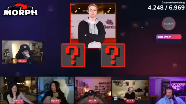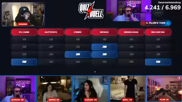 03:15:11Quiz startet mit Kategorien wie Hauptstädte, Anime und Werbeslogans. Regeln und Punktevergabe führen zu Diskussionen, besonders bei falschen Antworten (Punktabzug 50%). Technische Probleme mit Stimmen-Rätseln (Töne müssen aktualisiert werden). Prominente werden erraten, darunter Palina Ruszynski und Let's Hugo. Punktestand wird mehrfach korrigiert. Mali dominiert, Schradin hat Pech mit Fragen.