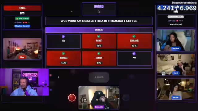 04:00:34Im Stream wird ein Quiz-Format vorgestellt, bei dem Teams durch Buzzern Fragen beantworten müssen. Die erste Frage lautet: "Wer wird am meisten Fitna in FitnaCraft stiften?" Nach Diskussion über mögliche Antworten wie Norex, Zabex und Rohart entscheidet sich das Team für Trimax, der mit 30% auf Platz 1 liegt. Die Community-Antworten basieren auf Umfragen, nicht auf Fakten. Es geht darum, die häufigsten Antworten der Zuschauer zu erraten.