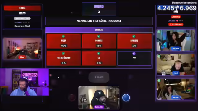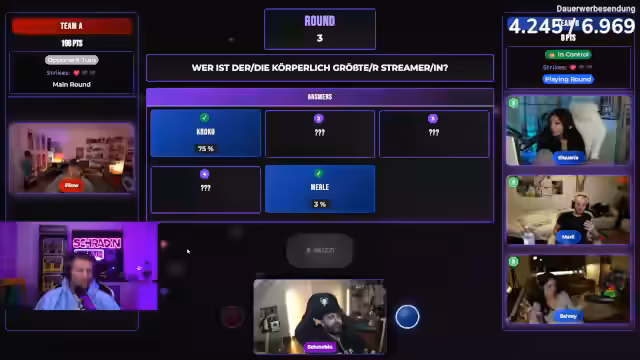 04:25:11Die Frage lautet: "Welcher Streamer würde am ehesten ein Jahr nicht streamen?" Philo buzzernd nennt Stegi (3%), Mali nennt No Reacts. Weitere Vorschläge sind Elotrix, Fabo und Unge. Nach Diskussion über Community-Abhängigkeit wird Basti GHG als Antwort gewählt, der jedoch nicht korrekt ist. Stattdessen wären Revi, Hugo oder Miki richtige Antworten gewesen. Das Team verliert die Runde.