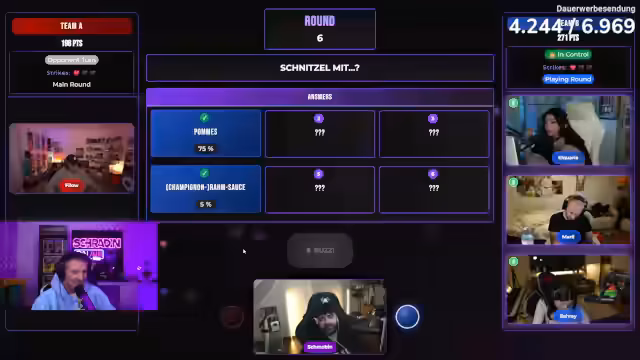 04:32:26Die Frage ist: "Schnitzel mit...?" Schradin buzzernd nennt "Pommes" (75% auf Platz 1), dann folgen Diskussionen über Champignonsoße, Erbsen und Kartoffeln. Das Team entscheidet sich für "Bratkartoffeln" (7% auf Platz 7), da es als klassisch deutsch gilt. Trotz internen Debatten über Kartoffelsalat und Zitrone wird Bratkartoffeln gewählt, jedoch ohne Punkteerfolg, da Ketchup (33%) die häufigste Antwort war.