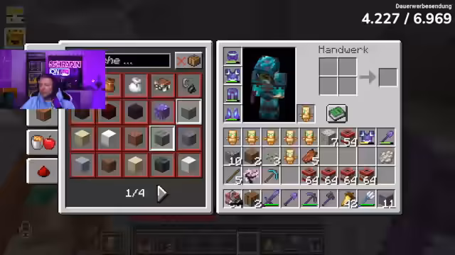 00:56:42Noreax wird um Hilfe beim Portalbau und bei der Rüstungsvorbereitung gebeten. Es folgen Diskussionen über die Nutzung von Villagern und gemeinsame Farmen für leuchtende Steine, die für den Ladenboden benötigt werden. Gleichzeitig werden Strategien für das bevorstehende Enderdrachen-Event besprochen, einschließlich der Vorbereitung von Ausrüstung wie Elitra und Enderperlen. Dabei wird deutlich, dass die Gruppe sich auf den Kampf gegen den Endboss vorbereitet und Materialien sammelt.