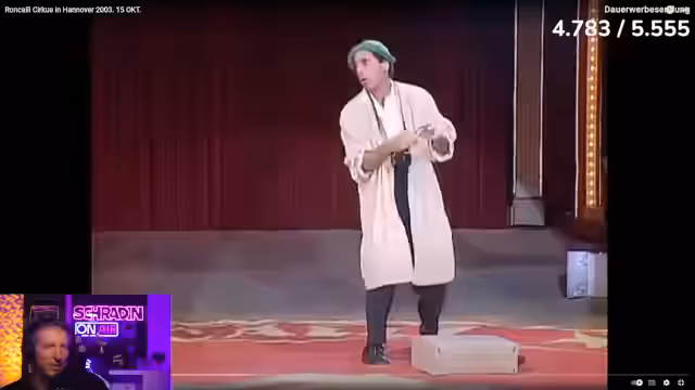 03:54:07Der Streamer lernt Felix, einen Clown des Zirkus Roncalli persönlich kennen, der dort seit 20 Jahren arbeitet. Felix spricht über seine Leidenschaft und den harte Job als Clown, der ein Handwerk ist und Schauspiel, Pantomime und Ausdruck erfordert. Es wird die beeindruckende Karriere der Pantomime-Clown-Legende Peter Schab erwähnt, der in den 90ern für Roncalli arbeitete und internationale Preise wie den Silbernen Clown in Monte Carlo gewonnen hat.