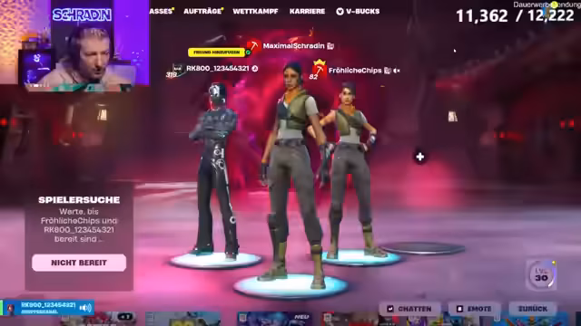 01:51:12Kasko und Stella gelingt ein epischer Sieg in Fortnite, während 120.000 Zuschauer zusehen. Währenddessen holt sich Trymacs einen Nudelsalat. Nach dem Sieg stellt sich heraus, dass Kasko und Stella zufällig in die Runde gekommen sind. Kasko gibt an, fünf Kills erzielt zu haben, während Schradin zwei Kills beisteuert. Trymacs lobt Schradin für seine Leistung in dieser Runde. Kasko und Stella verabschieden sich und verlassen den Stream. Trymacs erhält weiterhin zahlreiche Einladungen von Zuschauern, was er jedoch ablehnt. Es wird über die Regeln für Einladungen diskutiert und wie diese von einigen Zuschauern missachtet werden. Mike wird für seine Hartnäckigkeit gelobt, obwohl er gegen die Regeln verstoßen hat. Trymacs und Schradin setzen das Spiel mit anderen Zuschauern fort. Es wird überlegt, wer aus der aktuellen Gruppe entfernt werden soll, um Platz für neue Spieler zu schaffen. Schradin fordert Lob für seine zwei Kills ein. Es stellt sich heraus, dass die Zuschauer Ben und Philipp heißen und aus Österreich kommen. Sie erzählen, wie sie in die Runde gekommen sind und dass sie sich über einen gemeinsamen Freund kennengelernt haben.