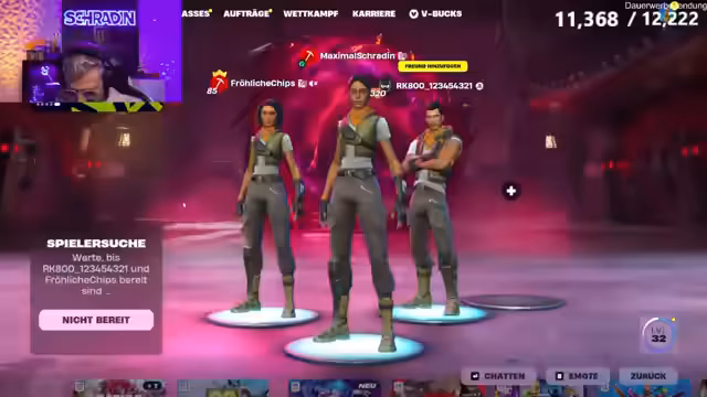 02:31:17Neue Spieler treten dem Stream bei, darunter 'Ghost Company' und 'Winter Lied', die ihre Begeisterung für Fortnite und die Streamer 'Trymacs' und 'Schradin' zum Ausdruck bringen. Es entspinnt sich ein Gespräch über frühere TV-Auftritte von 'Schradin', insbesondere seine Zeit bei '9 Live' und der Sendung 'Quizzo die Show', was für einige Überraschung sorgt. Im weiteren Verlauf des Spiels äußert 'Schradin' Frustration über sein eigenes Spielverhalten und seine Schwierigkeiten im Umgang mit Waffen und Munition. 'Trymacs' und andere Mitspieler geben ihm Tipps und versuchen, ihn zu unterstützen, was jedoch nicht immer erfolgreich ist. Es entsteht eine humorvolle Dynamik, in der 'Schradin' immer wieder in Schwierigkeiten gerät und seine Mitspieler ihn retten müssen. Es wird gescherzhaft vorgeschlagen, einen neuen Modus 'Schützt den VIP' einzuführen, bei dem es darum geht, 'Schradin' am Leben zu halten.