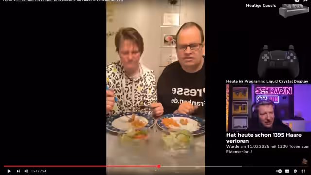 04:10:34Auf Vorschlag des Zuschauers Max starten die Streamer eine Reaktion auf 'Essenschecker'-Videos. Sie analysieren einen Döner-Test von Sebastian und Annette aus Schweinfurt und erraten im Voraus die Bewertung. Die Stimmung ist locker und freundschaftlich, wobei die Zuschauer aktiv in den Prozess eingebunden werden. Sie schauen sich mehrere Reaktionsvideos der Döner-Tester an, inklusive eines Vorstellungsvideos.