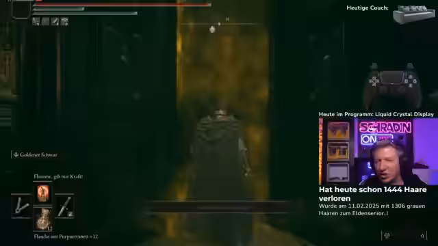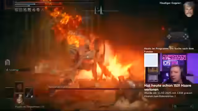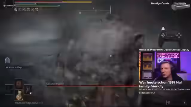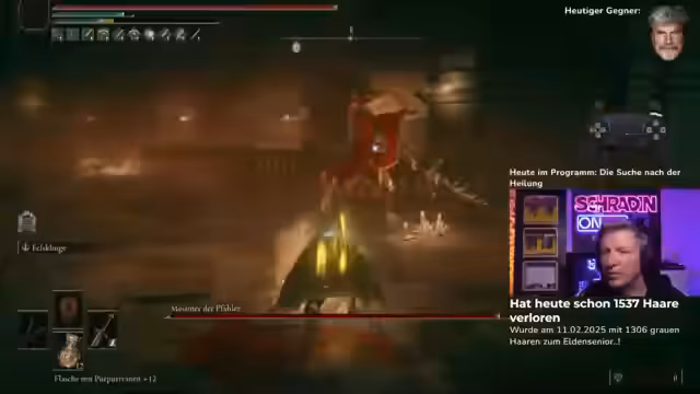 Ein Elden Ring-Stream gestaltet sich als zäher Kampf. Spieler Jack versucht vergeblich, den Boss Mesmer zu besiegen. Bei seinen Versuchen zeigt er viel Ausdauer, doch seine Angriffe finden bei dem Boss keine Schwachstelle. Ein Coach versucht mit Taktikwechseln und Waffentips zur Hilfe, doch Jack kämpft mit den Angriffsmustern und verliert mehrfach das Leben. Trotz der langen Versuche bleibt der Fokus auf dem gemeinsamen Erfolg.