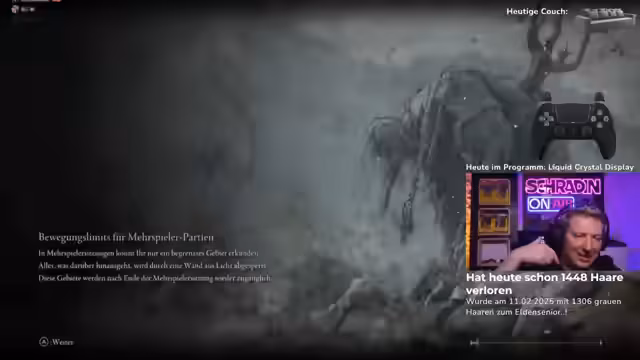 02:48:03Der Streamer gibt Anweisungen, wie man zu bestimmten Fragmenten und einem Talisman gelangt. Zunächst soll der Spieler zu einer markierten Stelle reiten, wo ein weiteres Fragment liegt. Danach wird ein Talisman geholt, der den Schaden bei zweihändiger Waffenführung um 10 bis 15 Prozent erhöht. Der Chat vergleicht den Streamer aufgrund des Aussehens mit Andreas Gabalier. Der Spieler markiert ein weiteres Schwert auf der Karte und reitet dorthin, wobei er durch Ruinen reitet, um einen weiteren Talisman und ein Fragment zu erhalten. Der Streamer spricht über seinen Gesundheitszustand und erwähnt ein bevorstehendes Event von Red Bull, das er moderieren wird. Er erwähnt Stimmtraining, um seine Stimme zu schonen. Der Spieler rastet an einem Ort der Gnade und plant, eine neue Waffe zu besorgen. Der Fortschritt im Schattenreich wird auf Stufe 10 von 20 geschätzt, was 50% der Fragmente entspricht. Der Spieler reitet weiter, wobei der Chat empfiehlt, immer Gnadenpunkte zu aktivieren. Das Gebiet wird als friedlich beschrieben, obwohl mit Jumpscares gerechnet werden kann. Der Streamer schwelgt in kulinarischen Genüssen Österreichs, wie Gurkensalat mit Schmand, Schnitzel mit Bratkartoffeln, Germknödel mit Vanillesoße und Zwiebelrostbraten. Ein Kartenfragment wird gefunden und der Spieler reitet zu Ruinen, um ein Skado-Fragment zu finden, wobei er von Treppen abspringen muss.