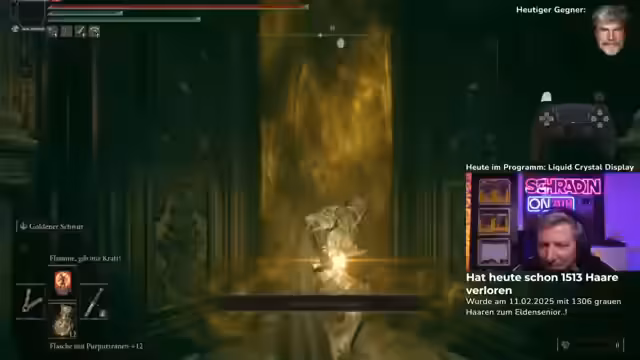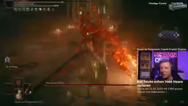05:45:36Nach Orientierung in der Burg gelangt der Streamer endlich zum Bossraum. Er identifiziert den Gegner als Malenias Bruder und hebt dessen Wichtigkeit für den DLC hervor. Nach einigen Startproblemen und Todesfällen entscheidet sich der Streamer, das Gameplay zu erklären und empfiehlt dem Spieler eine andere Waffe, um den Angriffsmuster des Bosses besser zu erlernen. Der Kampf beginnt mit Lernphasen.