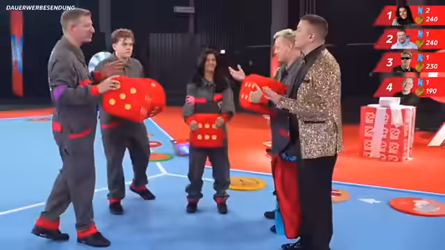 04:22:37Die Teams, eingeteilt in die Farben Rot und Blau, stehen bereit für das Einkaufswagen-Curling. Jeder Teamkapitän darf zuerst einen Probeschuss machen, um ein Gefühl für den Wagen und die Strecke zu bekommen. Die genauen Regeln werden erklärt: Pro Runde hat jedes Team einen Stoß, das Ziel ist, den eigenen Wagen näher als der des Gegners an einem Kaufland-K-Logo zu positionieren. Der Verlierer der Runde muss den Wagen des Gegners nach dessen Stoß zurückbringen, was einen strategischen Vorteil für den Start darstellt.